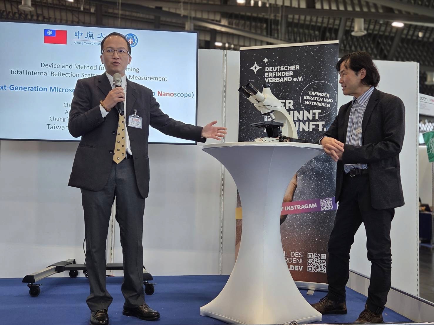 醫工系教授林政鞍代表中原大學赴德國參加 iENA,並在會場首度發表「可視化奈米顯微鏡」台美專利技術原型,以「用於執行全內反射散射量測的裝置與方法」發明技術贏得金牌。此專利開發出操作簡易的暗視野顯微鏡,使其具備奈米視覺的功能,能清楚觀察活體細胞及其內部結構、病原菌、外泌體、單一奈米金顆粒等,突破人類對於顯微鏡的想像,適用於材料科學、生醫影像、細胞觀察等領域,已成功進行試量產。